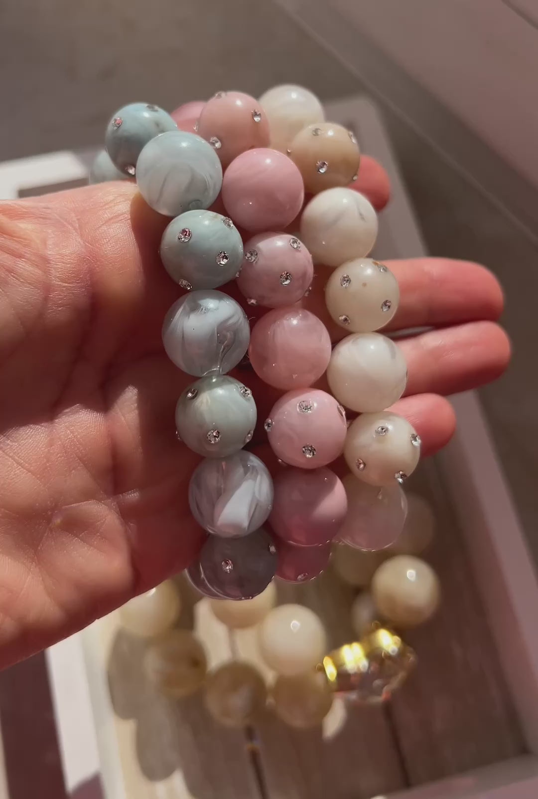 • Material: Resina-Perlen (marmoriert), Strasssteine